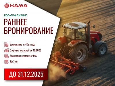 Забронируйте технику к новому сезону сейчас, а платите, когда удобно! Благодаря этой акции аграрии имеют уникальную возможность уже сейчас приобрести сельхозтехнику и оборудование от ведущих поставщиков и производителей на следующий агросезон на максимально выгодных условиях. Не упустите возможность подготовиться к новому сельскохозяйственному сезону уже сейчас, а начать платить основной долг уже после завершения уборочной кампании! Плати, когда удобно. Отсрочка платежа до октября 2026 года.* Аванс от 0%. Техника и оборудование в лизинг без первоначального взноса. Срок лизинга до 7 лет. Комфортный размер ежемесячного платежа. Скидки на технику от поставщиков-участников акции. Удорожание от 4% в год. Лизинг по сниженной ставке. Возможность зафиксировать стоимость техники. Стоимость техники не изменится в процессе сделки *Отсрочка предоставляется по основному долгу при выборе аннуитетного графика платежей.